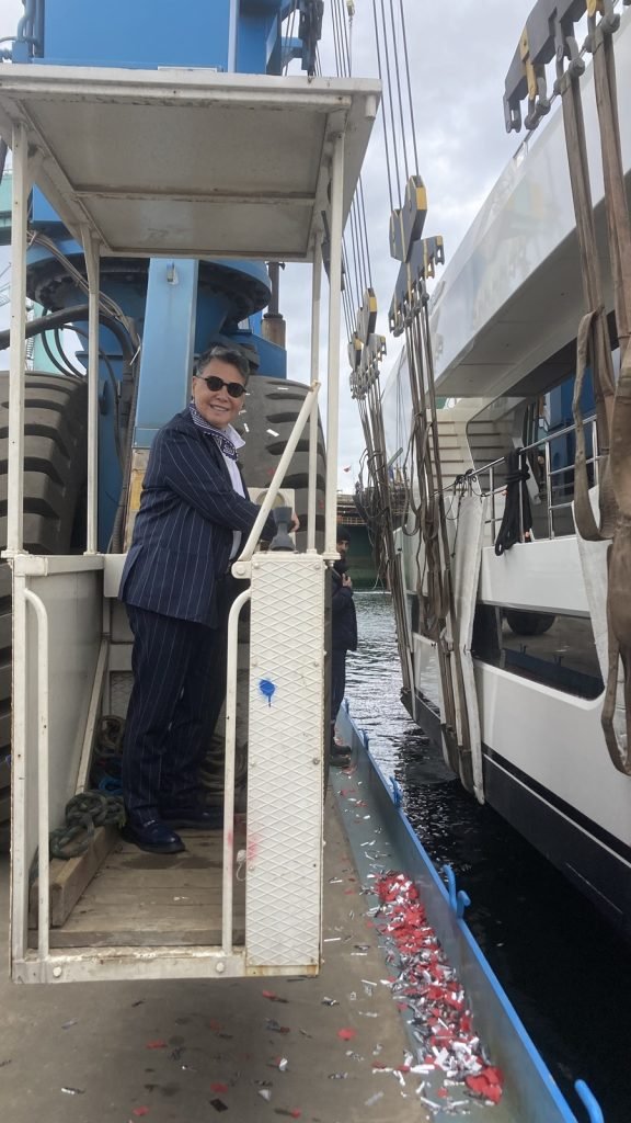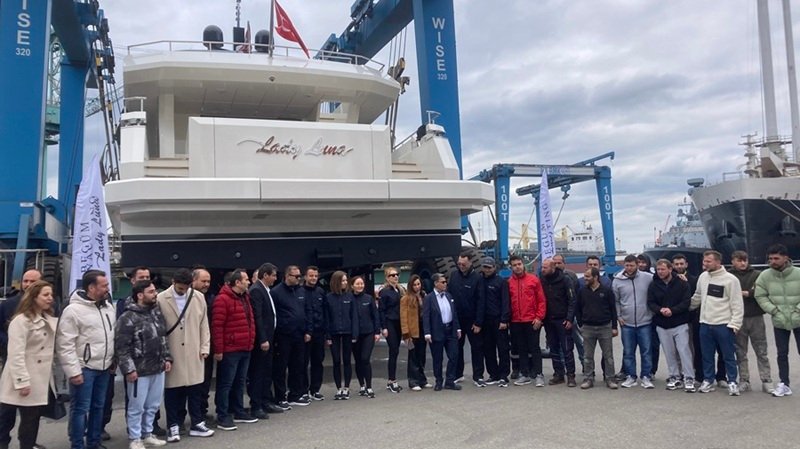RMK Tersanesi’ndeki törene katılmak üzere alana adım attığımda, onun İzmirli olduğunu kokteyl masalarının yanındaki lokmacı arabasından anladım. Kalabalığın arasına karışan lokma kokusu törene alışılmadık bir samimiyet katıyordu. Lady Luna suyla buluşmaya hazırlanırken, gözüm davetliler arasındaki aile büyüklerine, tersane ustalarına ve heyecanla bekleyen işçilere takıldı. “Bu bildiğimiz lansmanlardan farklı olacak” dedim içimden. O an Begüm Doğulu göründü alanın girişinde. Lacivert takım elbisesi, koyu camlı güneş gözlükleri ve kendinden emin adımlarıyla.