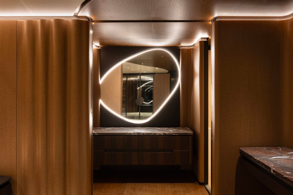 Projede eş zamanlı ilerleyen donatım ve bitirme çalışmaları, süperyatın genel olgunluk seviyesini net şekilde ortaya koyuyor. İç mekânlarda ekipman montajı ve mobilya yerleşimleri hızla tamamlanırken, tüm güvertelerde yaşam alanları nihai formuna yaklaşıyor.